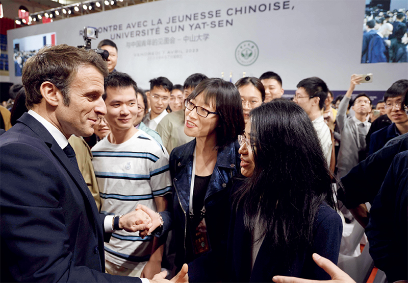 Le président Emmanuel Macron rencontre des étudiants chinois de l’Université Sun Yat-sen à Guangzhou, le 7 avril 2023.