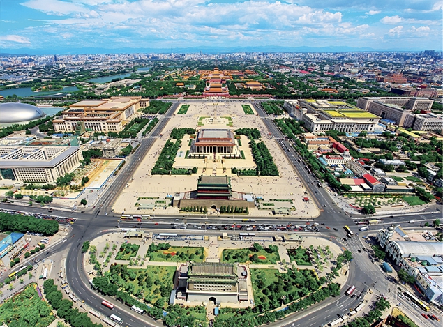 Le complexe architectural de la place Tian’anmen comprend la place Tian’anmen, le monument aux Héros du peuple, le mausolée de Mao Zedong, le Grand Palais du peuple et le Musée national de Chine. « Il s’agit d’une partie importante de l’Axe central de Beijing et d’un élément indispensable de cet ensemble architectural. La valeur primordiale de cet axe urbain en tant que patrimoine mondial réside dans son témoignage de la continuité de la civilisation chinoise. Le complexe architectural de la place Tian’anmen s’inscrit dans le prolongement au XXe siècle de la planification traditionnelle de la capitale, conception qui reflète l’âme de la culture chinoise. Il épouse les concepts philosophiques de “Zhong” (centralité) et de “He” (harmonie), formant un tout intégral avec le reste de l’Axe central », remarque M. Lü.