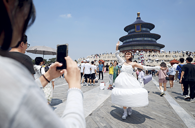 Une touriste de Taiwan devant le Temple du Ciel, le 3 juillet 2024