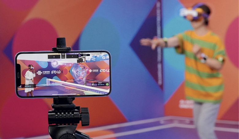 Dans l’espace FOLO Ball, un partenariat entre la succursale de Beijing de China Unicom et la jeune pousse FOLO, deux joueurs coiffés de lunettes MR (réalité mixte) évoluent de part et d’autre d’un terrain virtuel. Leurs mouvements projettent une balle lumineuse à travers un filet virtuel visible sur un smartphone. Pas de ballon réel, pas de contact physique, mais une compétition exaltante nourrie par les données et l’immersion. Selon Fan Xinyu, directeur général de l’entreprise, le FOLO Ball réinvente le ballon-prisonnier grâce à l’IA et à la MR, alliant effort cardio et défoulement.