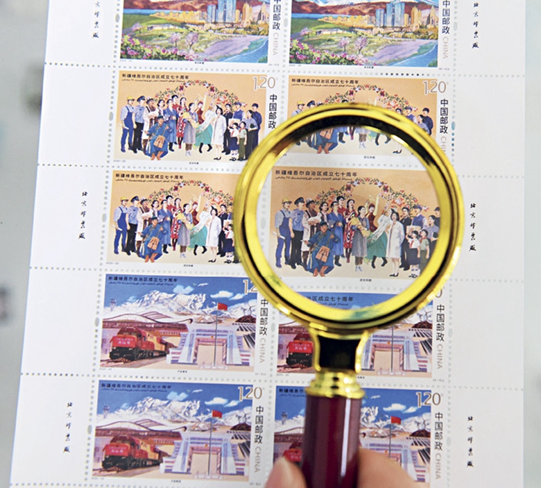 Des timbres commémoratifs pour le 70e anniversaire de la fondation de la région autonome ouïgoure du Xinjiang émis par la Poste de Chine, le 22 septembre 2025