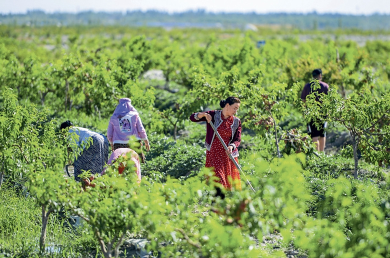 Des villageois travaillent dans un verger construit au milieu d’un désert de Gobi, dans la préfecture autonome kirghize de Kizilsu de la région autonome ouïgoure du Xinjiang.